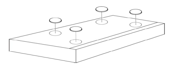 将随产品附带的粘性支脚衬垫粘在机器底板。请参照如下指示,将设备倒置,准确安装支脚衬垫。