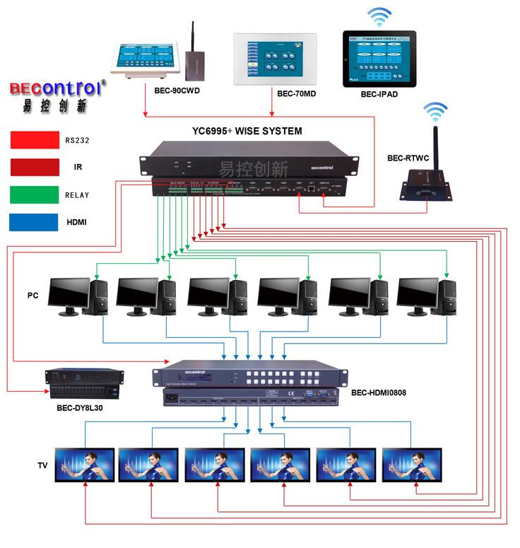 BEcontrol机房轮巡系统解决方案是易控创新在C语言中控基础上而开发的一套针对机房视频的整体解决方案。他可以对机房电脑开机、关机控制,电视开机、关机控制,多个电脑画面自动轮巡的显示,轮巡显示的时间可以设置如1秒、5秒、10秒、30秒、60秒、5分、10分、30分、1小时等,也可以随时停止画面轮巡,手动矩阵式的任意输入输出切换,支持一键\关闭电源、电脑、电视使之自动进入循环工作模式;该系统主要设备包括C语言中控主机、IPAD\触控终端、无线接收机、交互式矩阵信号系统、电脑远程控制客服端软件、电源集中管理器等组成,由于系统采用C语言脚本智能控制系统,具有超高的稳定性能,可控制各种不分品牌的机房AV设备,可广泛的用于银行、教育、会议、楼宇、展馆等场合。
