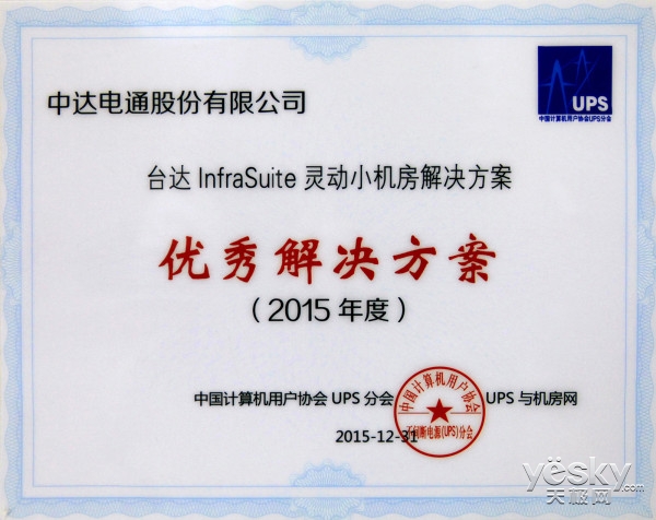 发布时间:2016-09-01 13:44:06 作者:Reton技术部近日,由中国计算机用户协会不间断电源(UPS)分会和《UPS与机房》社联合颁发的2015年度“用户信赖企业”、“用户信赖产品”、“优秀解决方案”、“创新和绿色企业”项正式公布。台达InfraSuite灵动小机房凭借高性价比、高可用性的完美机房解决方案,斩获2015年度“优秀解决方案”大。