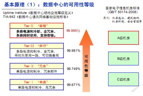 很久以来,用不同等级表示数据中心的可用性一直是业界的标准做法。数据中心的可用性等级参照美国TiA-942《数据中心通讯网络基础设施标准》和《电子信息系统机房设计规范》GB50174-2008如下图所示。