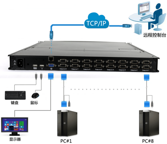 设备提供额外的控制端口,支持外接键盘鼠标显示器做为第二控制节点,同样也支持通过KVM延长器延长至指定地点进行管控,全面应对不同的应用场景,提升管控体验。