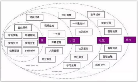 智慧城市被分成了四个“物联网(大小)层级”:家、小区、社区、城市(如下图)。这四层各有应用和服务,服务范围和覆盖区域从家到城市逐渐扩大。各层级中有部分应用相对独立,与上下层级无关;而另有一部分应用则会“层层升级”:家庭医生(家)>社区医疗(社区)>医疗卫生(城市)。