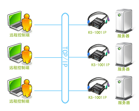 公司可为每台服务器搭载一台RETON KS-1001IP。用户即可通过标准的Web浏览器登陆到IP KVM,对其进行管控。下图为方案部署图。