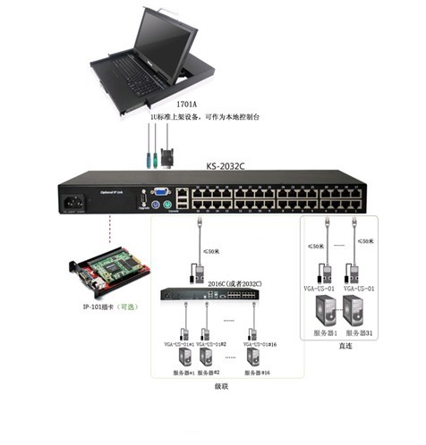 该方案较为常见。方案采用级联2台32口数字KVM切换器,通过级联,最多可连接61台服务器。该方案采用1U标准的单口LCD KVM作为本地控制端对KVM切换器进行管理,省掉了直接加载的键盘、鼠标、显示器,以减少连接的线缆以及机房有限的空间。