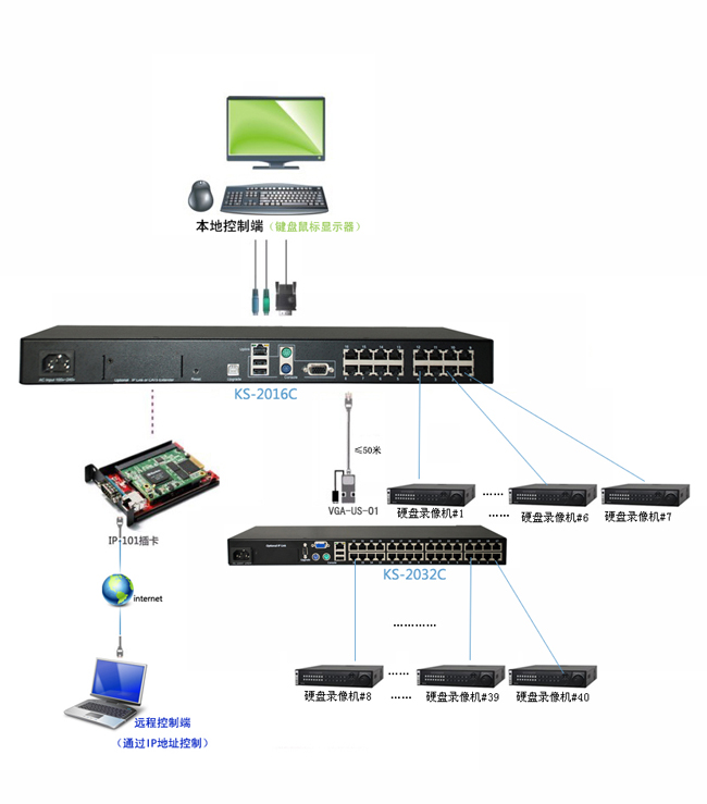 每台服务器连接VGA-US-01计算机接口模块,通过标准CAT5线缆连接至KS-2032C主机,共一台KS-2032C主机与顶层的一台KS-2016C采用树状级联,在顶层KS-2016C主机搭载IP-101模块,IP-101模块通过普通5类线将其连接到网络交换机端口实现硬盘录像机的远程集中IP管控,这样就能够实现1本地控制和1远程控。