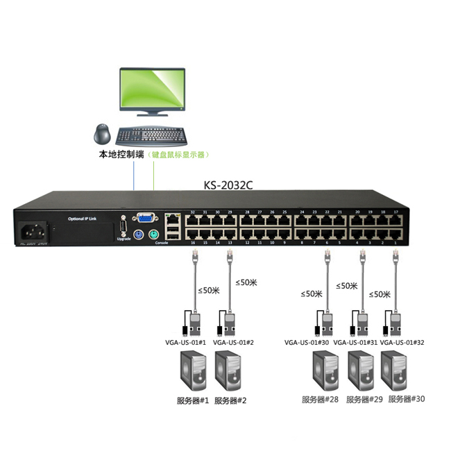 某企业现有30台服务器,配有一台32口KVM(锐盾KS-2032C)切换器来对这些服务器进行集中管理,管理人员通过机房内一套键盘、鼠标、显示器来进行控制。现该企业在距离机房250米远的一间办公室内,新增5台电脑,需要纳入统一管理,实现管理人员在机房内也可控制这5台电脑。