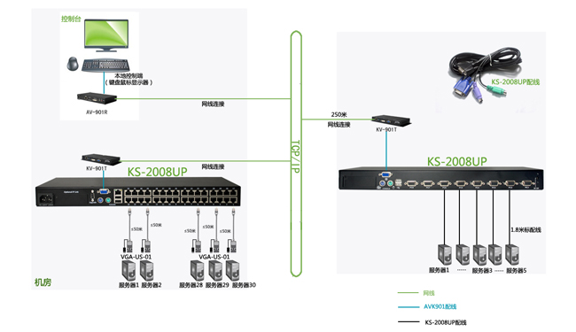 通过增设矩阵KVM(AVK-901),将KVM管理扩展到网络管理。将AVK-901的传送端与现有KS-2032C连接起来,并接入网络;将250米外办公室内的5台电脑用8口KVM切换器统一管理起来,并按照同样方法,部署AVK-901的传送端,连入网络。另外,在机房内部署一台AVK-901的接收端,加载原有的键盘、鼠标、显示器,同样连入交换机。这样即可在机房内,对两台AVK-901传送端所连接的KVM进行管理,从而管理KVM所连接的电脑和服务器。