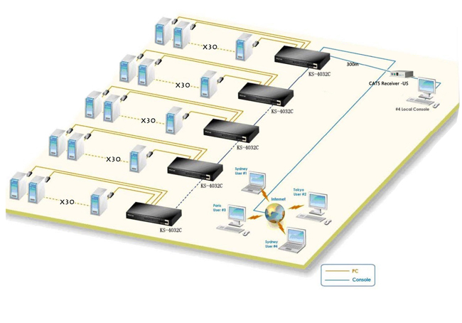 通过串接5台KS-4032C来实现对机房内的150台服务器进行集中管理,KS-4032C支持300米内的本地延长控制端,通过CAT5切换器接收端CAT5- Receiver-US将主机的控制信号延长至距离机房100米远的操作室,方便管理人员在不进入机房的前提下,就能对里面的服务器进行管理控制。KS-4032C支持四个用户远程管理,实现4个不同城市的管理者连线登入,实现对150台远端服务器的登入管理。