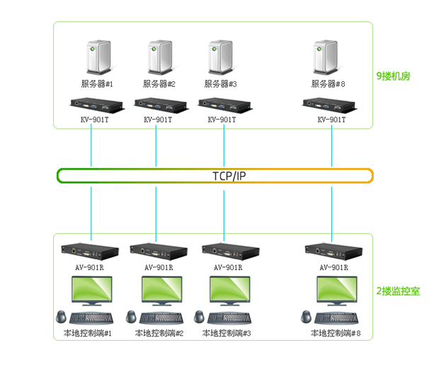 计划每台工作站加一台KV-901T传送端接入网络,监控室通过AV-901R搭载键盘鼠标显示器连入网络,即可实现8用户同时管理8台服务器。