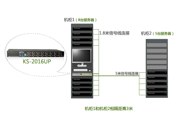 出于经济实用角度的考虑,建议采用模拟式KVM切换器,并搭配较长的信号线一起使用。在有八台服务器的机柜(以下简称机柜1)里放置一台KS-2016UP,用随机配送的信号线将8台服务器与KVM切换器连接起来;另外,用5条SL-500U将摆放另一机柜(以下简称机柜2)里的5台服务器连接起来,这是最为经济的解决方案。当然也可将16口模拟KVM切换器摆放在机柜2,用7条5米信号线将机柜1服务器连在一起。