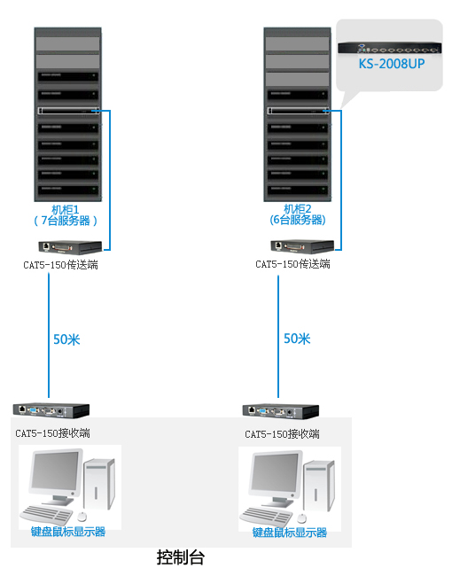 某公司有13台服务器,分放在两个机柜。其中一个机柜里有7台服务器(以下简称机柜1),另一机柜里有6台服务器(以下简称机柜2)。现希望通过2套KVM设备来对两个机柜中的服务器分别进行管理,并且在距离机柜5米的控制台进行控制。