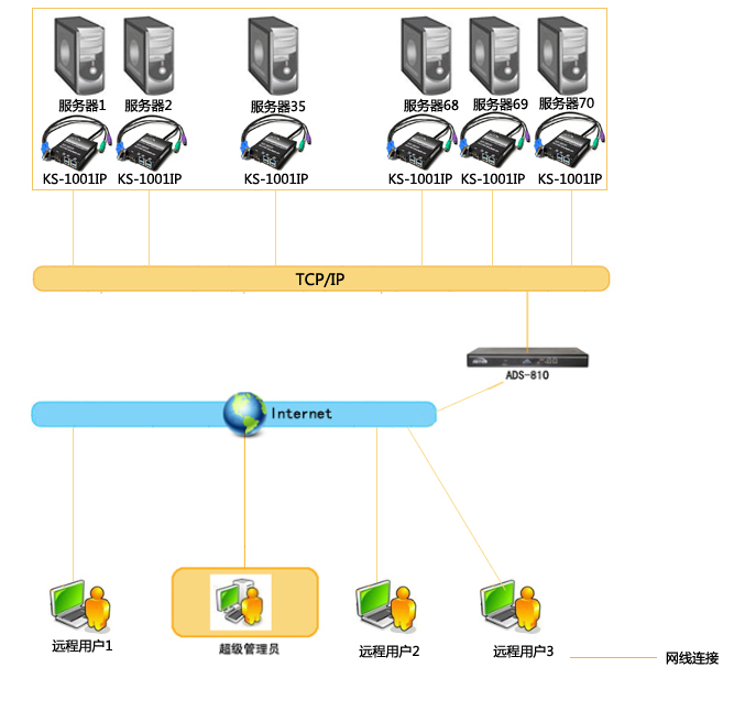 本方案从项目实际需求出发,采用细粒到每一台服务器的KS-1001IP计算机接口模块进行管理,采用ADS-810作为集控及审计平台,即可满足客户的需求。