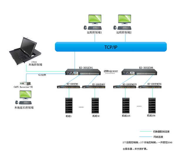 顶端1台KS-3032C支持2通道远程管理,实现2个不同城市的管理者连线登入,配合1701A上架式KVM(可选,也可自己配键盘、鼠标、显示器)实现2本地管理,28个机柜每一个机柜放一台KS-108UP管理机柜内的8台服务器,如果机柜内服务器超过8台可以选择KS-116UP管理,可管理200多台服务器,此方案为基本方案,支持拓展,拓展方案如下。