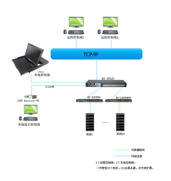 数据中心机房内有机柜28台,有服务器若干,服务器之间距离稍有点分散,且后期还会有拓展的需求,要求用KVM切换器设备对所有服务器进行集中管控,且部署简单,不需要破坏原有网络结构,在进行安装部署时原网络正常运行。