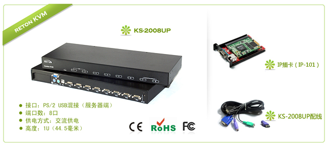 双控;本地控制及远程控制;1U机架式/8个端口/USB/PS2混接/分辨率1920*1440 75Hz/12V电源 |