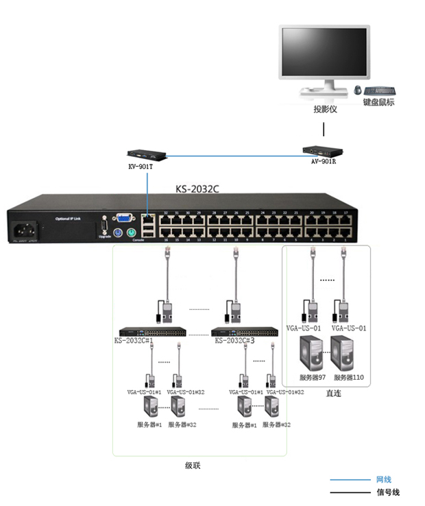 1. KS-2032C通过计算机接口模块VGA-US-01连接到服务器,4台KS-2032C通过计算机接口模块VGA-US-01进行级联。