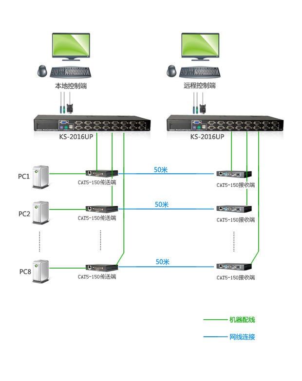 考虑到客户需要增加服务器数量,给客户配置KS-2016UP来管理现有的8台服务器。客户要求在机房近端控制,给客户配置一台KS-2016UP来管理8台服务器。在控制室一端,通过给客户配置8套150米的延长器,实现延长控制。再配置一台KS-2016UP ,连接延长器,作为远端控制端。