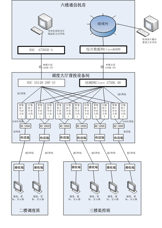 在新大楼调度大厅大屏幕设备间内安装6台旧遥视系统工作站、6台新遥视系统工作站,通过KVM延伸到调度员、监控员坐席,使其能够通过键盘切换实现新、旧两套系统的变电站远程视频图像的监控。