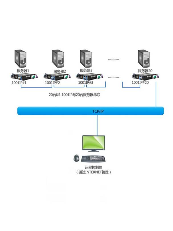 针对客户需要实现对20台服务器实现远程系统安装,设置BIOS 级别访问,控制关机和重启,因此在给在本方案中,给客户配置20台KS-1001IP ,通过串联的方式来连接20台服务器,KS-1001IP 支持任何操作系统,即使是在BIOS层、开机中甚至蓝色画面都可以控制系统,支持虚拟媒体功能,可远程安装操作系统。因此给每一台服务器配置一台KS-1001IP 可实现对每一台服务器的远程安装系统。较方案一而言,虽然在成本投入上要大,但是本方案管理方式便捷灵活,管理者可以避免时常进入机房,来实现对每一台服务器的系统安装,且KS-1001IP 设备体积小,不会占用机房使用空间。