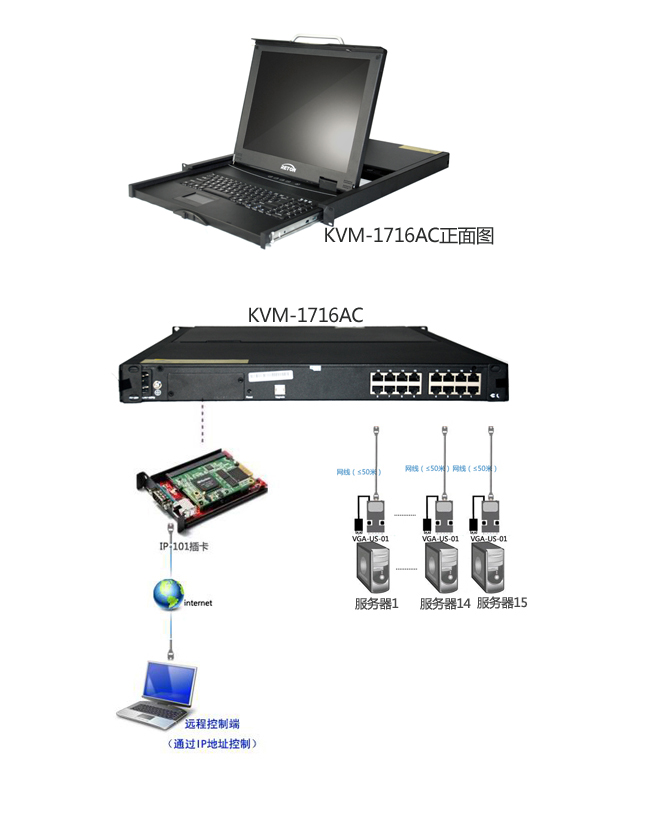 客户机房现在有15台服务器,放置在2个机柜里面。控制室在机房隔壁,距离机房大约十几米左右,客户现在要求在控制室内控制这15台服务器,并且要求在远程端可以通过网络形式来访问和管理这15台服务器,客户要求整套系统布线简单,不破坏原有网络结构。