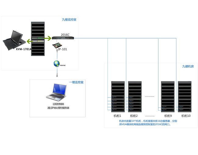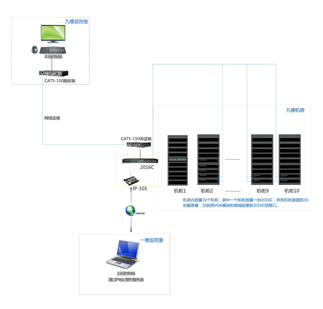 2) 远程控制:要求在与机房同一栋楼的1楼的办公室内工作人员可以实现对机房内的服务器进行监管;