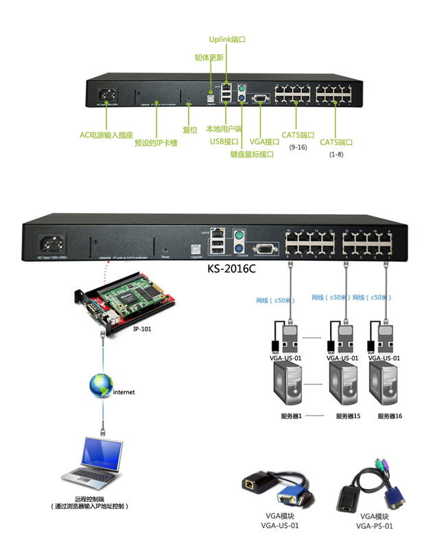 远程控制部分:同样是采用在数字KVM KS-2016C上面安装IP-101插卡提供远程管控。