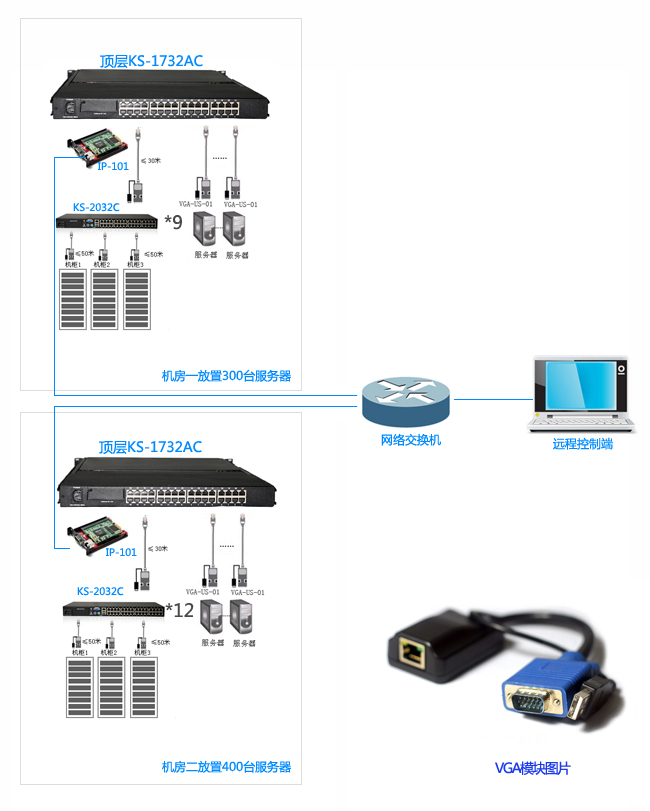 机房二:方案推荐RETON 数字KVM产品,采用级联的方式来进行集中统一控制。300台服务器为13组,其中12组通过标准的5类线连接至一台KS-2032C主机,每台服务器连接VGA-US-01计算机接口模块,完成区域统一管理。